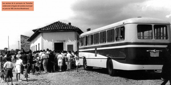 Los vecinos de la parroquia de Tremañes celebrando la llegada del autobús municipal en junio de 1953. (Archivo Modeltrans)