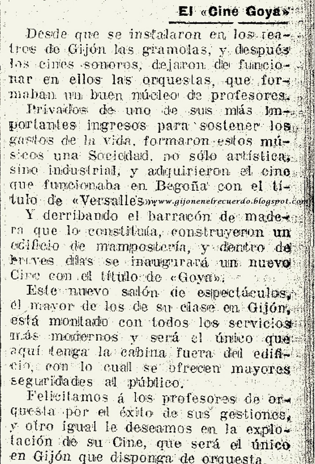 Pero todo ello no llegó hasta 1937 y por aquel entonces, ya con el nombre de Goya Cinema, mientras medio mundo se había rendido al cine sonoro, la sala de reestreno gijonesa emitía todavía sólo proyecciones mudas. «Un grupo de músicos que tocaba allí, entre los que se encontraba Baldomero Álvarez Céspedes, compraron el Goya pero para seguir manteniéndolo como cine mudo. No se rindieron hasta que la guerra lo cambió todo y, una vez finalizada, se incorporó ya al cine sonoro», reseña el director de la Filmoteca de Asturias, mientras recuerda que en el tiempo en que exhibía el nombre de Versalles era «el más barato de Gijón».