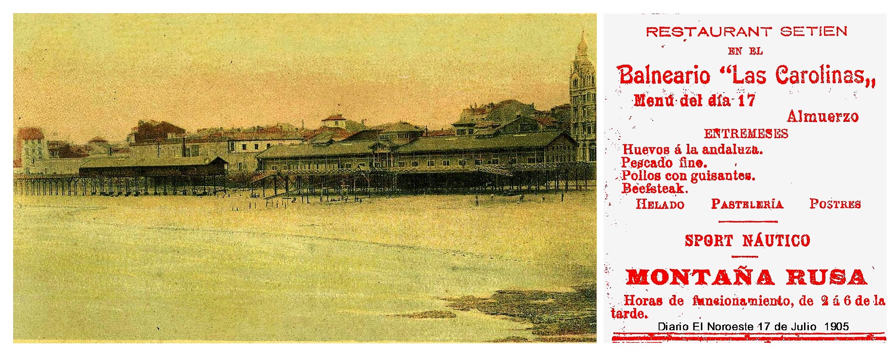 <<Montaña rusa marítima en Gijón, es la instalada en el balneario de Las Carolinas. El aparato es sencillísimo. Desde la altura del balneario se ha colocado un plano inclinado de unos 40 metros de longitud, que termina en la mar. Desde la parte superior del plano un bote cae en completa libertad hacia las aguas, asegurado por guías a babor y estribor. El descenso es vertiginoso.>>