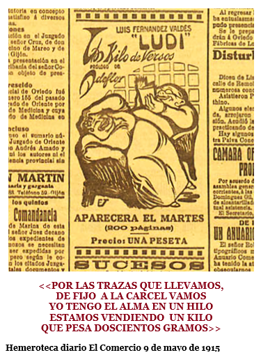 Así se explica el éxito de su nunca bien ponderado libro Un kilo de versos, que fue como el catecismo gozoso con el que se deleitaron millares de gijoneses. Ese libro está ahí, al alcance de cualquiera y, por estarlo, prescindo de su contenido. Tenemos, pues, hasta aquí, y por este orden, a un Ludi poeta, dibujante y coplero. Ahora vamos a hablar del letrista, porque lo era, y muy bueno. Sólo que, con el transcurso del tiempo, se fue perdiendo la memoria de aquella música que, tarareada por nuestros mayores, se engastaba con letras de rezumante asturianía. Algunas de esas canciones circularon impresas, como, por ejemplo. El roble, con música de Solar Quintes y editada en 1916: