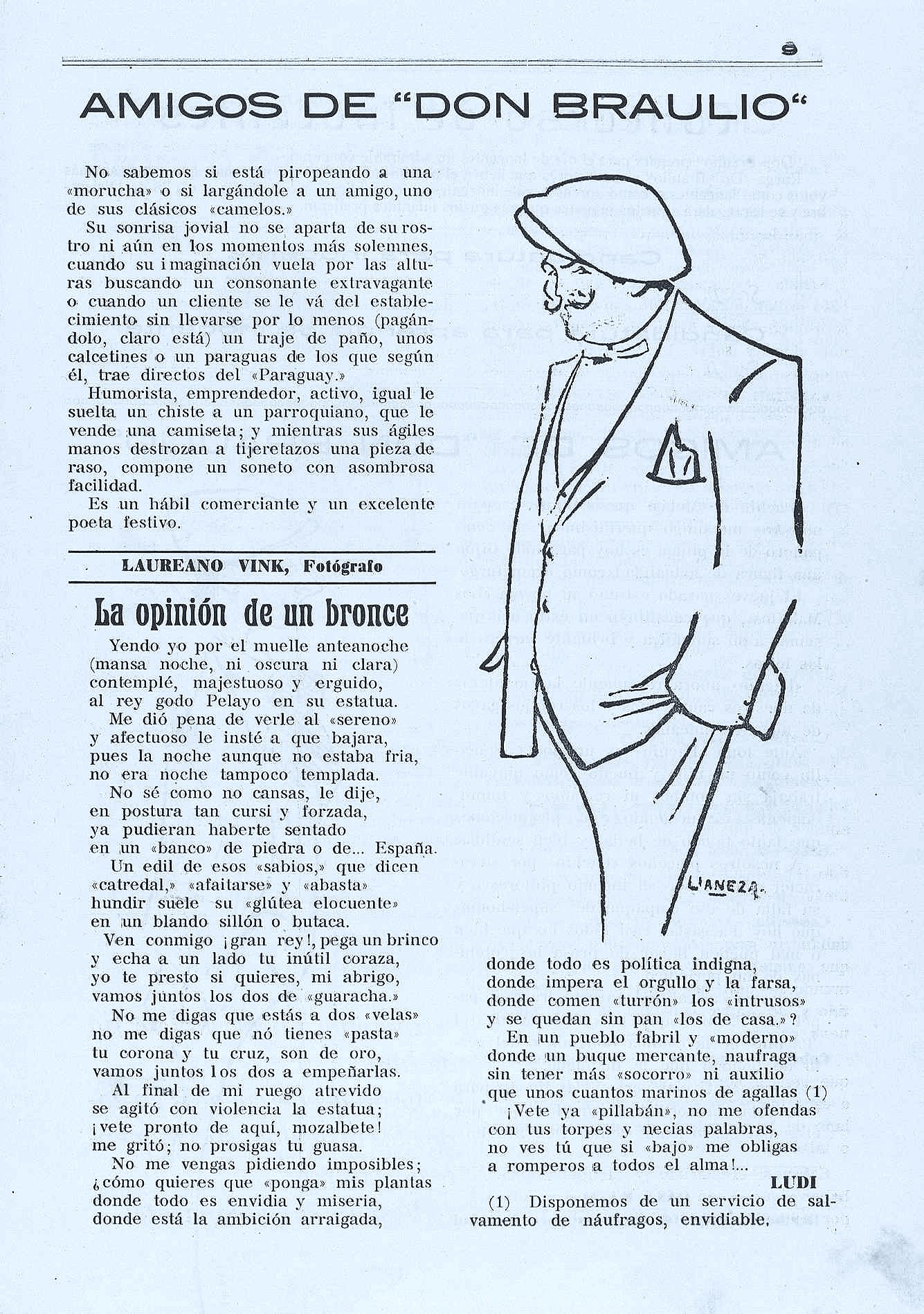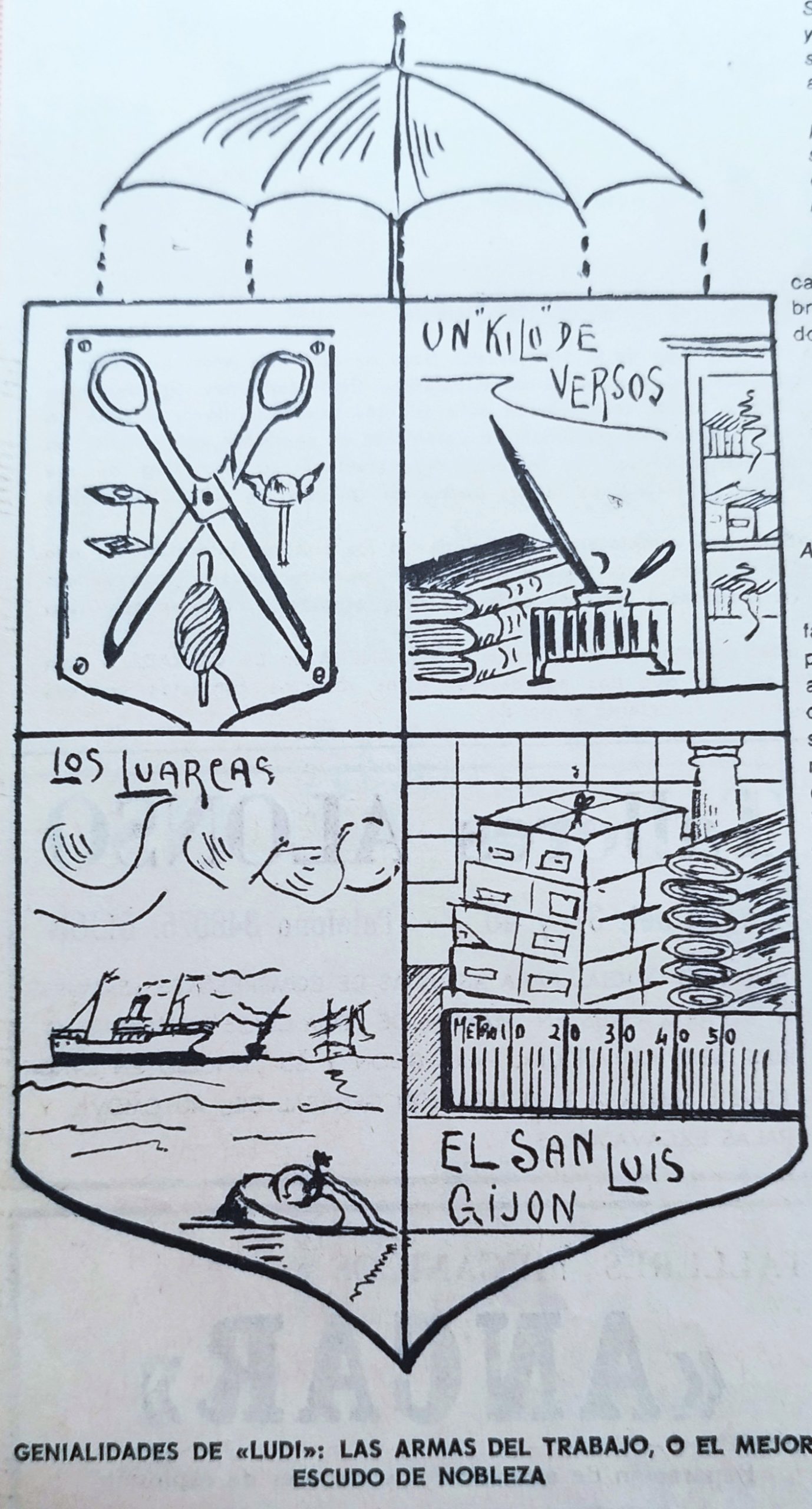 Y esta popularidad vino de mano de sus colaboraciones en la prensa gijonesa. Casi todos los periódicos acogieron sus producciones gráfico-lírico poéticas, pero, preferentemente, EL COMERCIO, El Noroeste y La Prensa, le brindaron sus columnas que prestigiaban con su seudónimo. Pero Ludi era eso y mucho más. Ludi era el Gijón popular, el malicioso, el de la multiplicidad de tipos encarnados en la picaresca y, en resumen, razón y ser de un pueblo que se gozaba con su progreso. Dos de sus facetas más importantes eran, si no me equivoco, su musa carnavalesca y su maestría de letrista consumado. Aquí está su El primer fiu para Les coples d’Antroxu:
