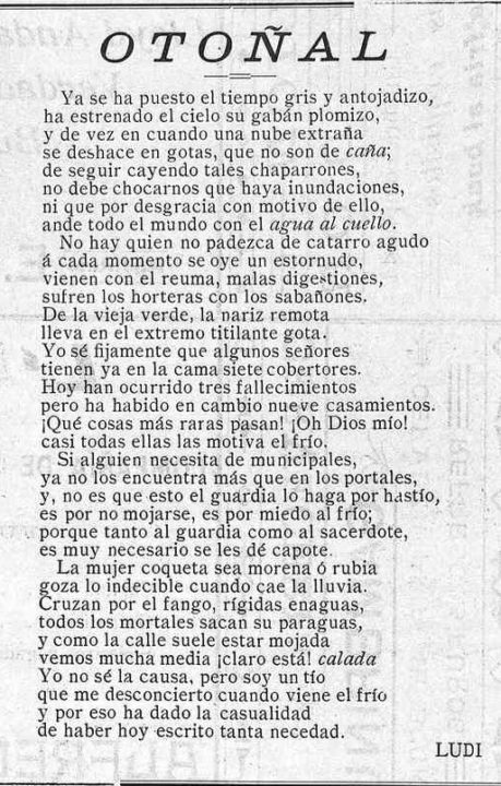Sólo que había algo más y Ludi era sabedor de ello. Ese algo más es que tenemos un caso en latín, Ludi que, originariamente, venía a significar juego, diversión o pasatiempo. Era lo que a él le cuadraba. Y ésa es la razón de que lo usase en sus escritos a lo largo de toda su vida. Supongo que he aclarado un porqué. Luego quedamos en lo dicho. Como también quedamos en que Ludi vio a este pícaro mundo a través de la inefable sonrisa que propicia optimismo inacabable. En ese aspecto no hizo sino seguir los pasos de los Vital Aza, Tarfe, Ramón de Campoamor, Luis de Taboada, Sinesio Delgado y hasta del novísimo Gabriel d’Annuncio, que significó una evidente ruptura estética con fórmulas calcificadas por la rutina del quehacer de siglos.