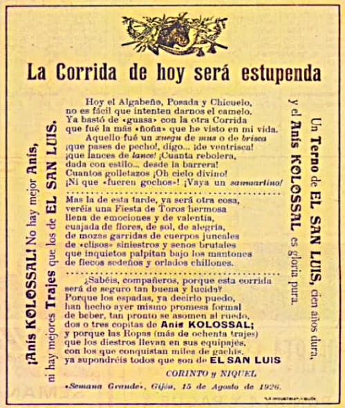 Porque sucede que un día, allá por setiembre de 1926, Ludi es invitado de honor de don Celestino Aguirre, que organiza un banquete en la solemnidad de que su hijo, Francisco (que fue profesor mío de Griego en la Universidad de Oviedo), se ordena sacerdote. Y cuando todos esperaban escuchar, de labios de Ludí unos cuantos salmos penitenciales, éste, sin perder el aplomo, les emploma unos versos de catorce sílabas que a muchos se les antojaron de más. Tras unos minutos de silencio y tal, se yergue Ludi. Mira en torno olímpicamente con la sonrisa en los labios, y, plácida, mansamente, comienza a desgranar las estrofas, entre las que acoto las que siguen: