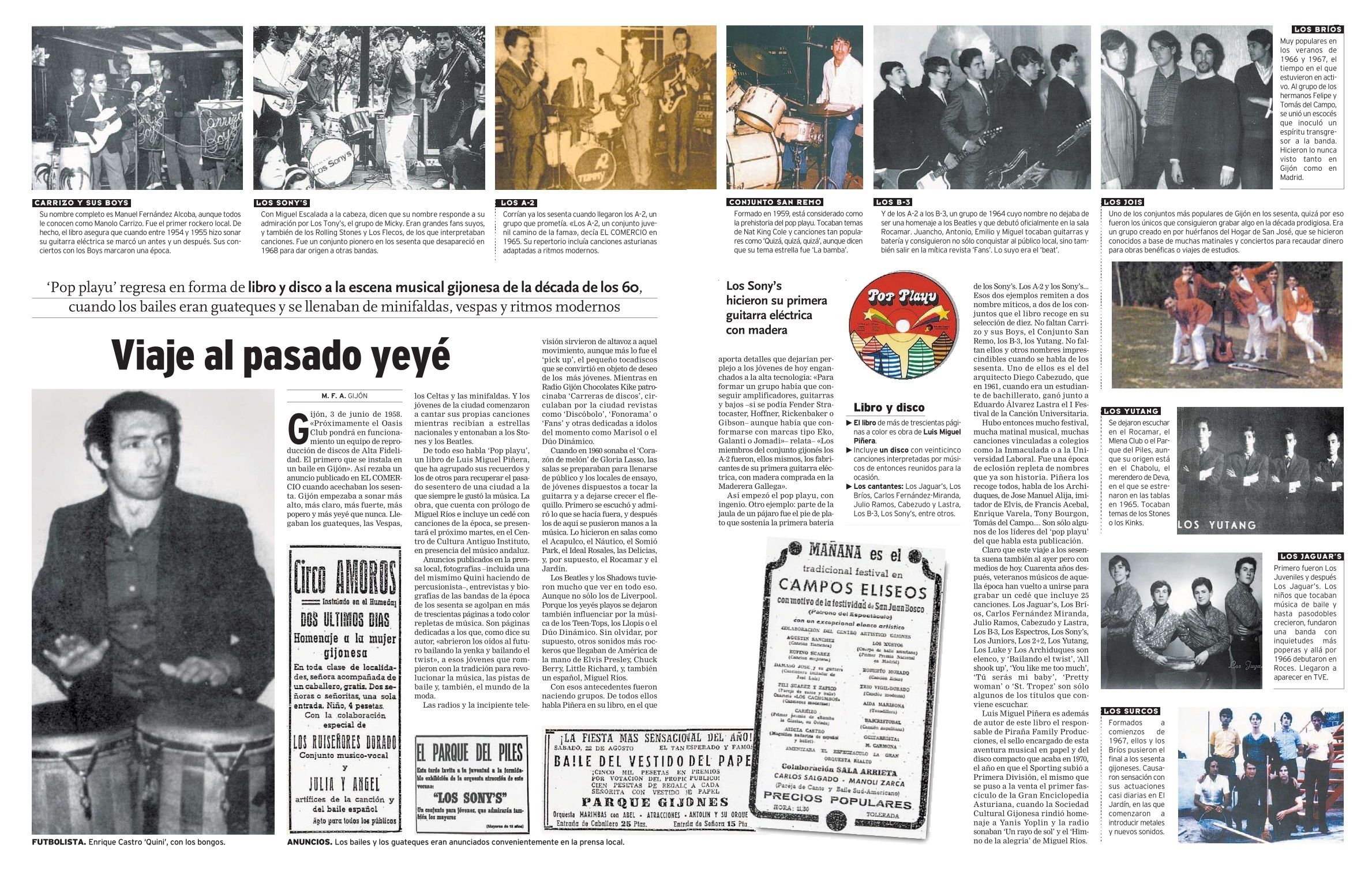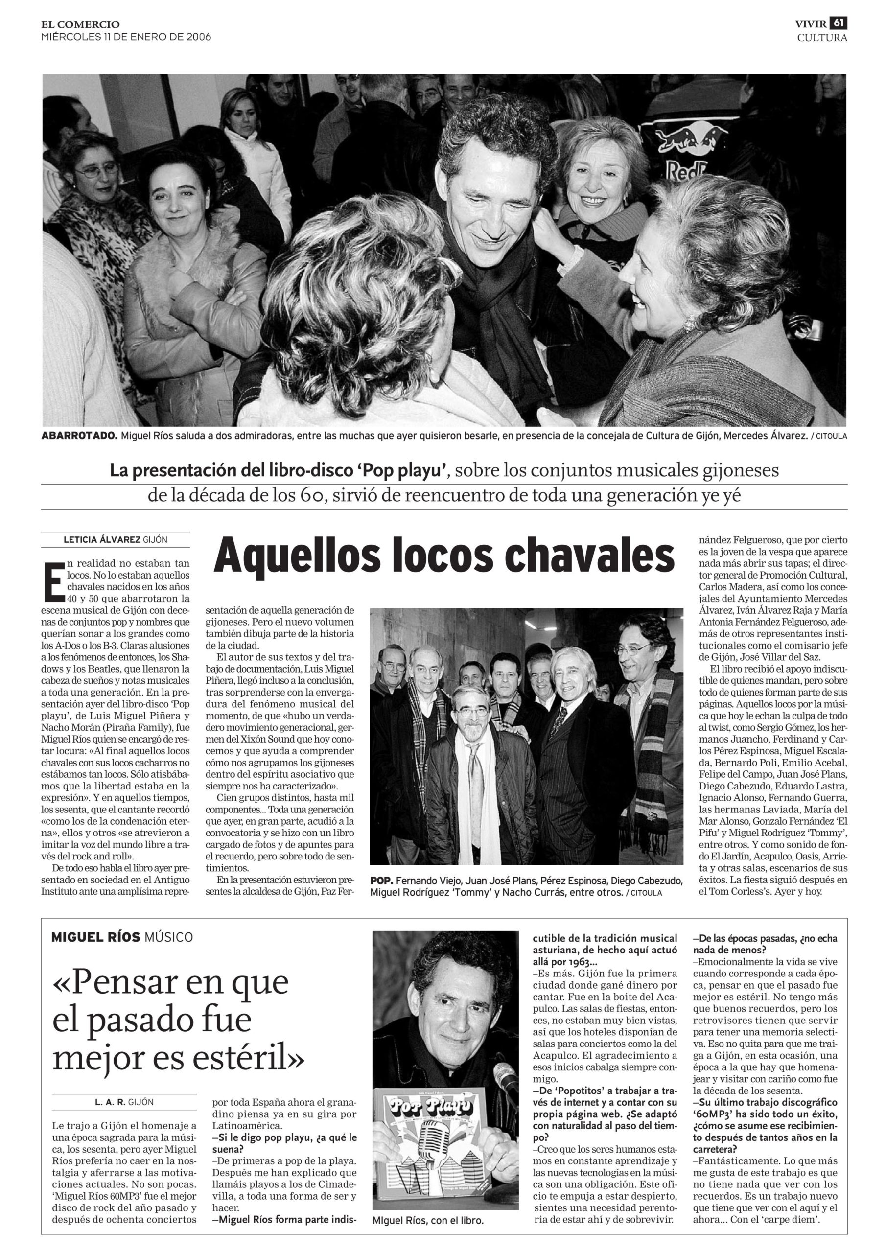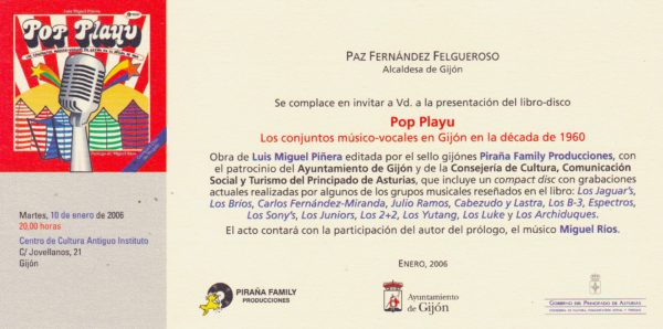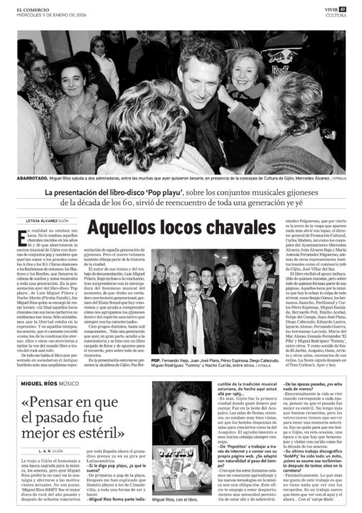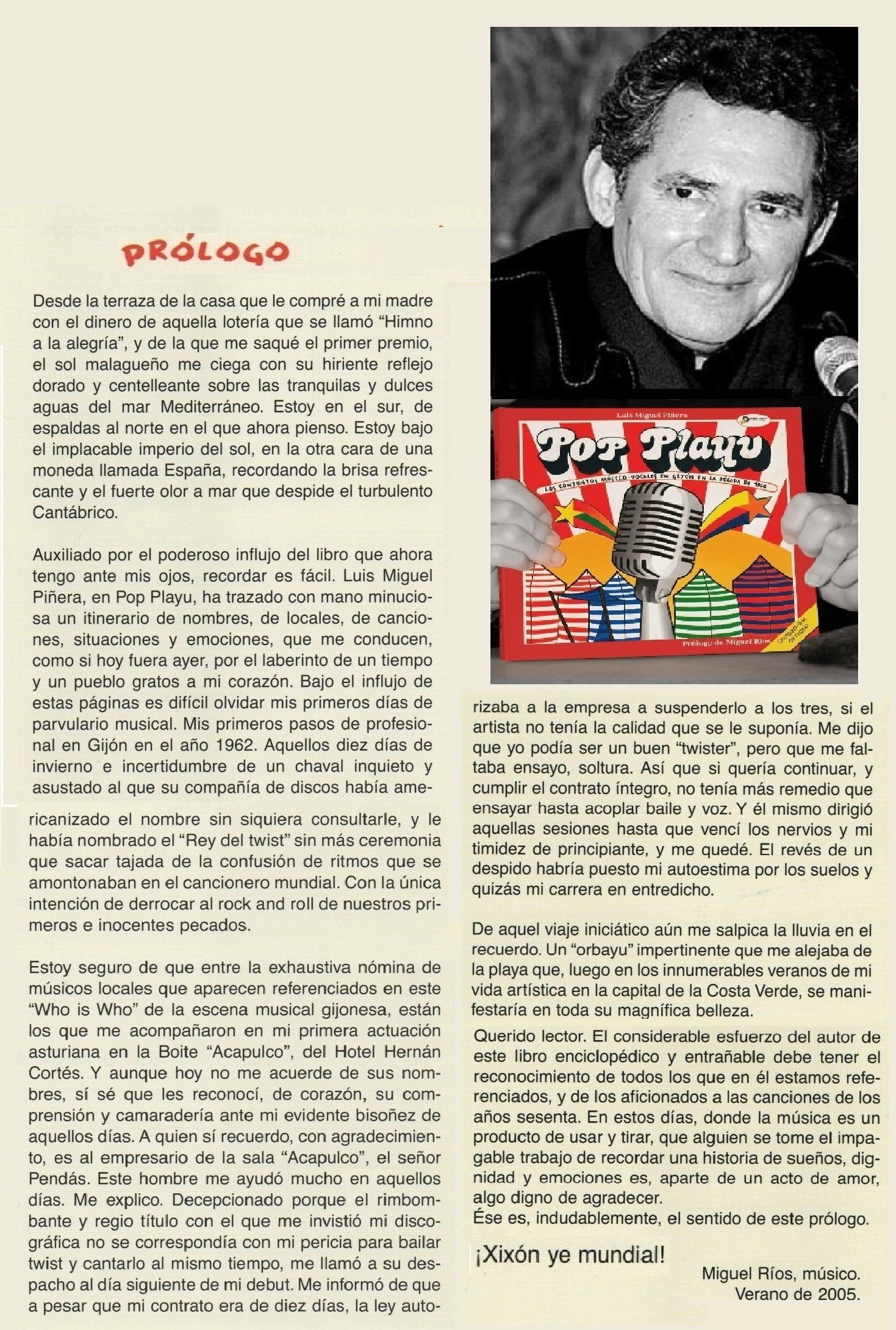 Acabado este repaso sobre el pop playu -el pop en el Gijón de los años sesenta- es obligado aclarar que empecé a escribirlo en dos ocasiones. Estoy seguro de que comencé a redactarlo, sin yo mismo saberlo, cuando a los 11 años, vi moverse y cantar a Miguel Ríos en el Teatro Jovellanos. Luego, como cualquier gijonés de mi generación, me vi envuelto -aunque bien es cierto que como actor secundario- en lo que supuso una imparable revolución musical y social. Pero tuvieron que pasar bastantes décadas para que me embarcase en la definitiva tarea de poner en orden mis recuerdos, mirar muchos periódicos y documentación, hablar con los músicos protagonistas y cinco años después (el tiempo, definitivamente, vuela) por fin verlo terminado. Realizar cualquier labor de investigación histórica sobre la ciudad donde uno nació, sobre Gijón, es un honor para quien se ponga a ello y una aventura. Ésta lo fue y además grata y sorprendente. Primero porque descubrí que «los modernos» de entonces siguen siendo modernos hoy; muchos de ellos enfocaron su vida en temas relacionados con la música y no pocos actúan todavía, aunque todos rebasan con creces el medio siglo. Y también porque yo no imaginaba previamente la real magnitud del fenómeno.