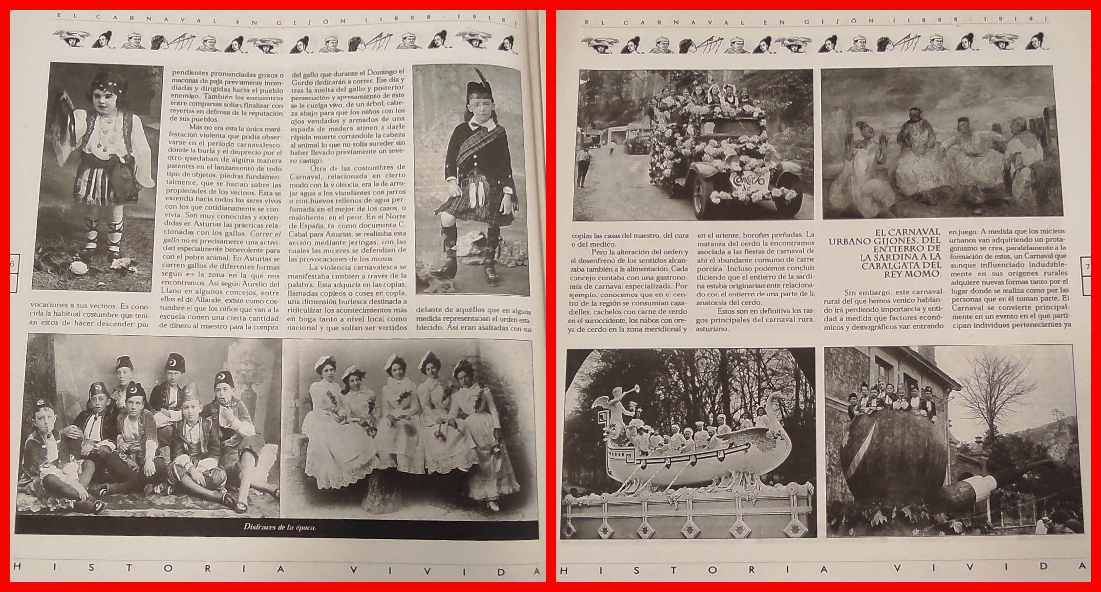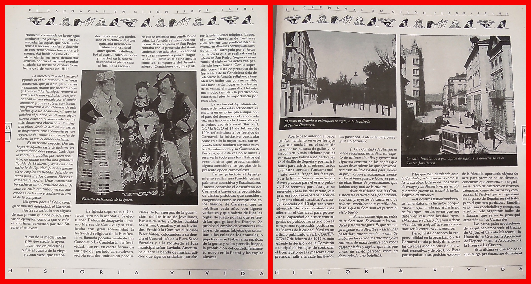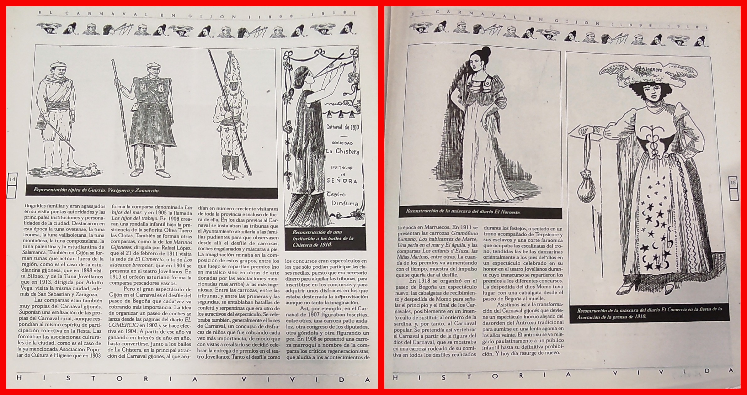 Fiel testigo de los tiempos que vivimos, el fascículo de Historia vivida que acompaña al periódico de mañana, indaga, gracias a los estudios de Miguel Ángel Benito Alonso y de J. C. García Suárez, en el espíritu carnavalesco de Gijón desde 1898 a 1918, germen, sin duda, de la eclosión que esta festividad pagana adquirió en la ciudad en los últimos años, tras una larga etapa de ostracismo.