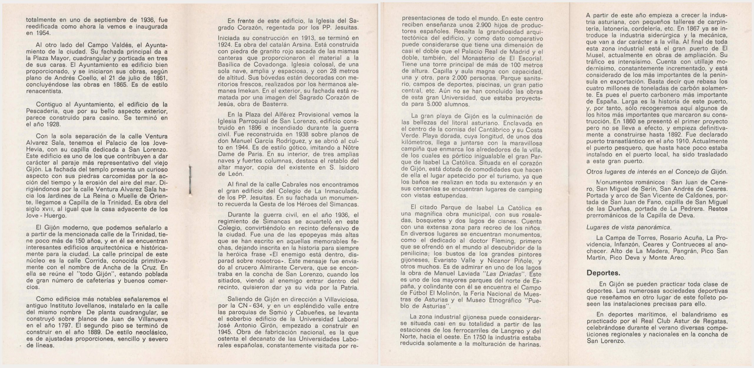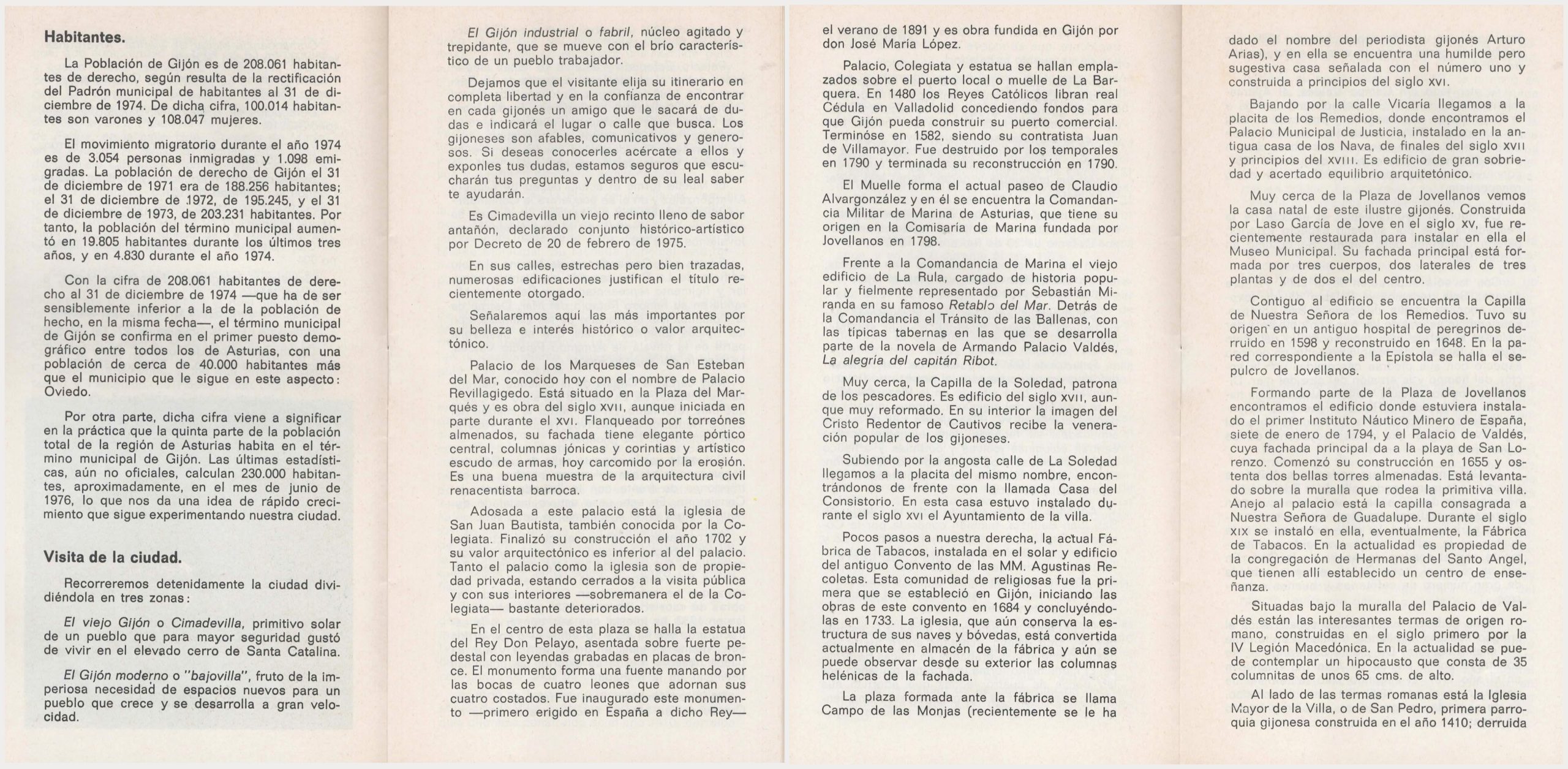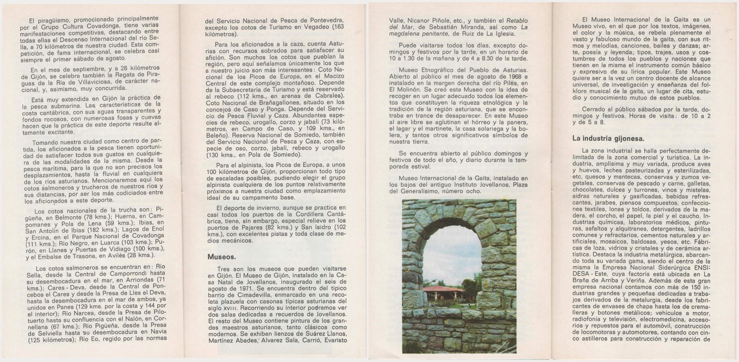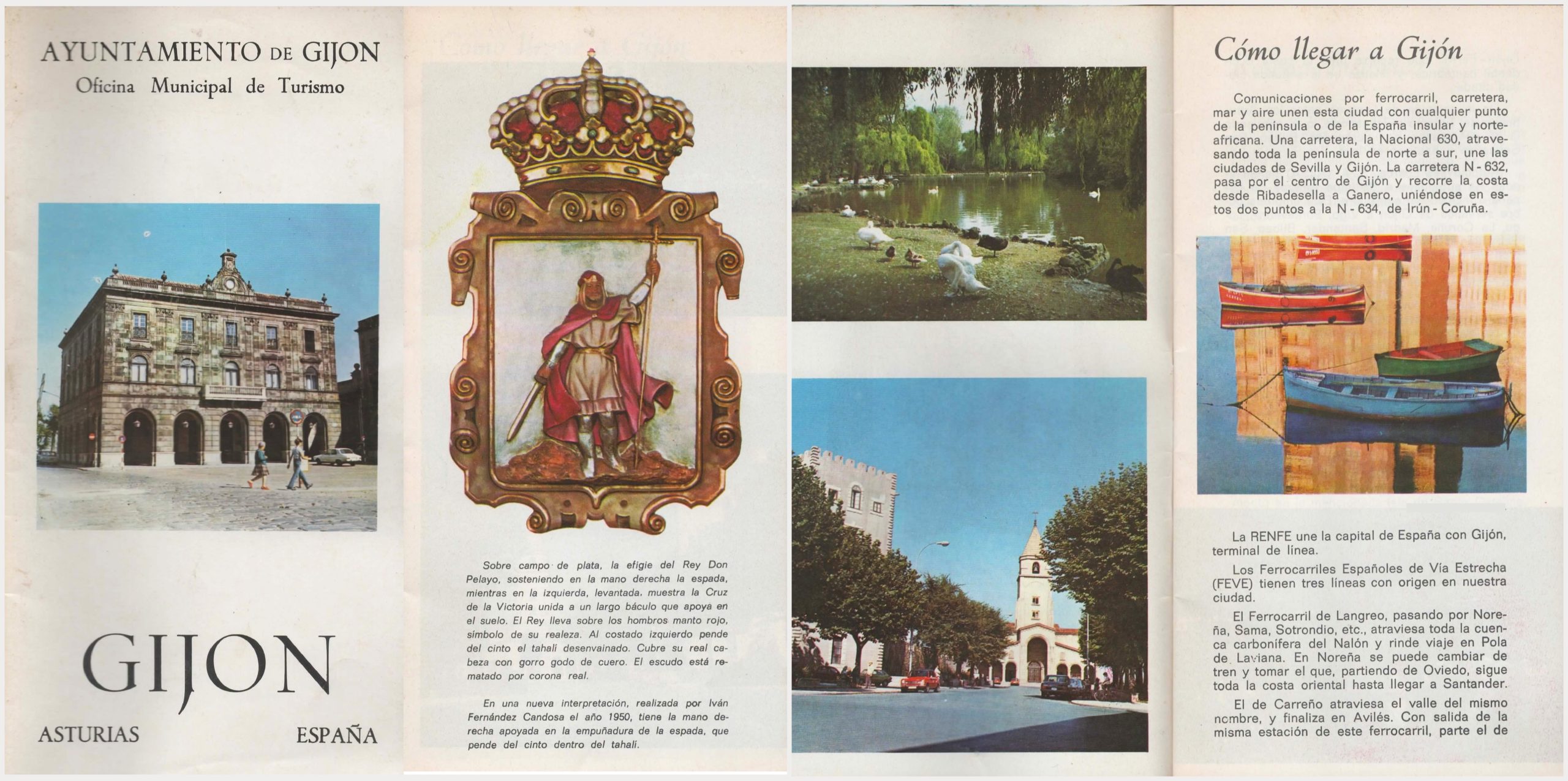 Folleto guía de Gijón editado por el Ayuntamiento en el año 1976, para su distribución en la Oficina Municipal de Turismo, se imprimió en Gráficas Guinea, Gijón.